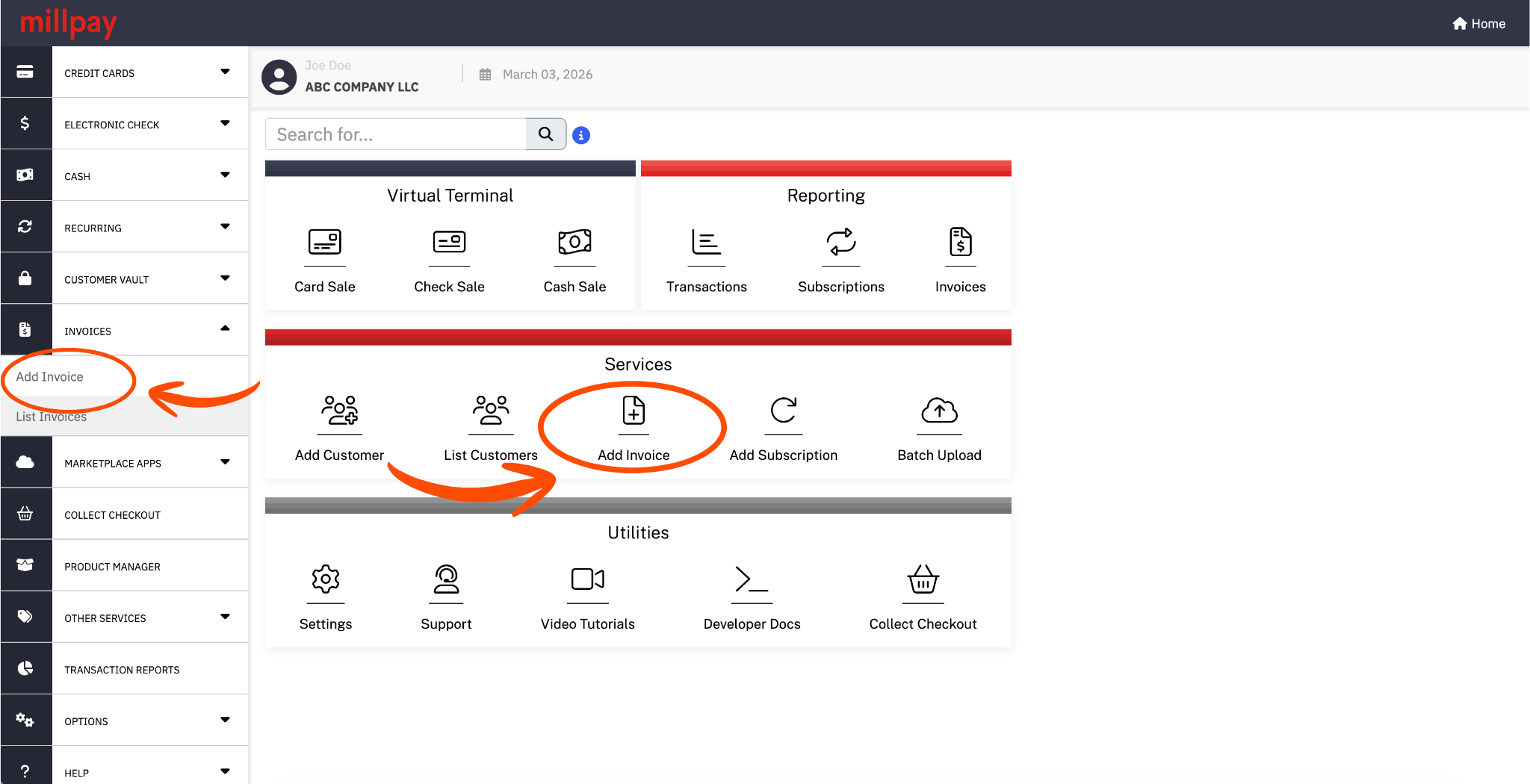 Primary user will have this permission set by default once Invoicing is activated to their account. The Primary user can add this permission to any of their sub-users as needed. This can be found in your Millpay Merchant Portal → Settings → User Accounts → select the username → under Permissions (at the bottom) check Access Invoice. Once Invoicing is activated, in the Millpay Merchant Portal, head over to the left side panel → click on Invoices, this will give them access to the Add Invoice and the List Invoice pages.